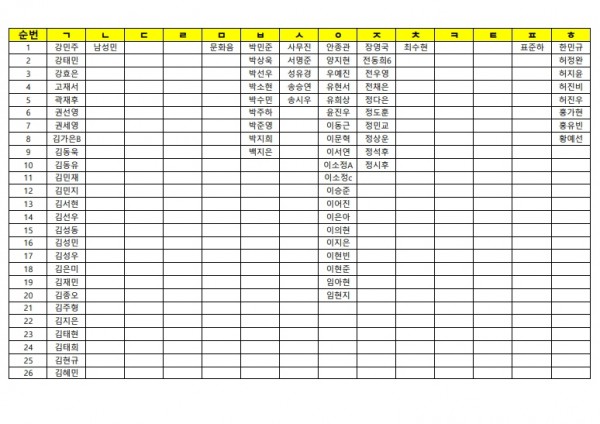 4월 5일(일)휴일 자습 명단(종합/퍼플반)가나다순 페이지 정보 작성자 최고관리자 작성일 26-04-03 15:56 조회 134회 댓글 0건 본문 휴일 자습 신청서 내용은 학원, 학생의 상황에 따라 변동 될 수 있습니다. 4월5일