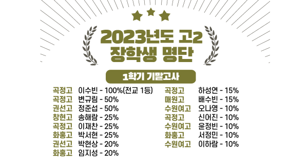 2023 고2 1학기 기말고사 장학생 명단 페이지 정보 작성자 최고관리자 작성일 25-04-22 14:58 조회 1,035회 댓글 0건 본문 2023 고2 1학기 기말고사 장학생 명단