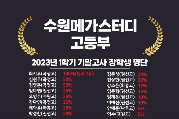 2023 고1 1학기 기말고사 장학생 명단 페이지 정보 작성자 최고관리자 작성일 25-04-22 14:59 조회 1,057회 댓글 0건 본문 2023 고1 1학기 기말고사 장학생 명단