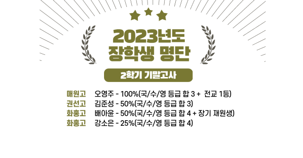 2023 고1 2학기 기말고사 장학생 명단 페이지 정보 작성자 최고관리자 작성일 25-04-22 15:02 조회 1,252회 댓글 0건 본문 2023 고1 2학기 기말고사 장학생 명단