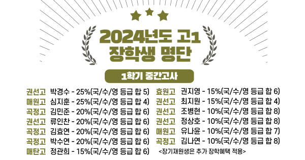 2024 고1 1학기 중간고사 장학생 명단 페이지 정보 작성자 최고관리자 작성일 25-04-22 15:04 조회 1,402회 댓글 0건 본문 2024 고1 1학기 중간고사 장학생 명단