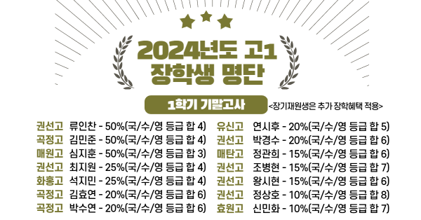 2024 고1 1학기 기말고사 장학생 명단 페이지 정보 작성자 최고관리자 작성일 25-04-22 15:06 조회 1,355회 댓글 0건 본문 2024 고1 1학기 기말고사 장학생 명단