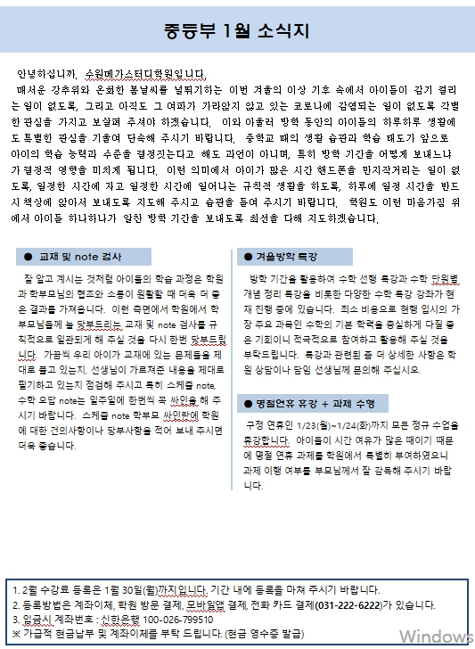 2023년 중등부 1월 소식지(가정통신문) 페이지 정보 작성자 최고관리자 작성일 23-01-20 21:25 조회 4,360회 댓글 0건 본문 * 1월 등록기간은 1월 30일까지입니다.