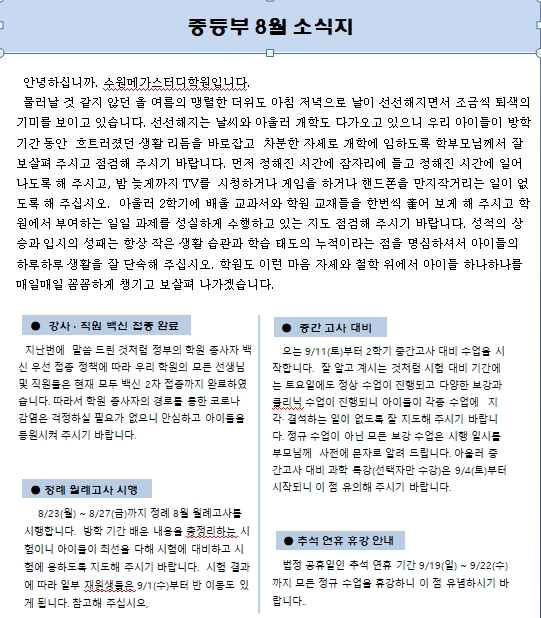 2021년 8월 소식지(가정통신문) 페이지 정보 작성자 최고관리자 작성일 21-08-18 21:18 조회 4,480회 댓글 0건 본문 * 9월 등록기간은 8월 23일(월) ~ 8월 30일(월)까지입니다.