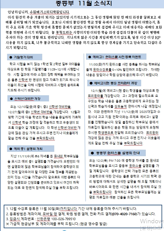 2021년 중등부 12월 소식지(가정통신문) 페이지 정보 작성자 최고관리자 작성일 21-11-25 18:14 조회 4,657회 댓글 0건 본문 * 중등부 12월 등록기간입니다. 기간 내 등록 협조 부탁드립니다.