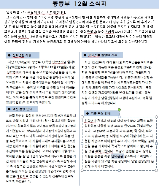 2022년 중등부 1월 소식지(가정통신문) 페이지 정보 작성자 최고관리자 작성일 21-12-20 16:51 조회 4,446회 댓글 0건 본문 * 2022년 중등부 1월 소식지입니다.