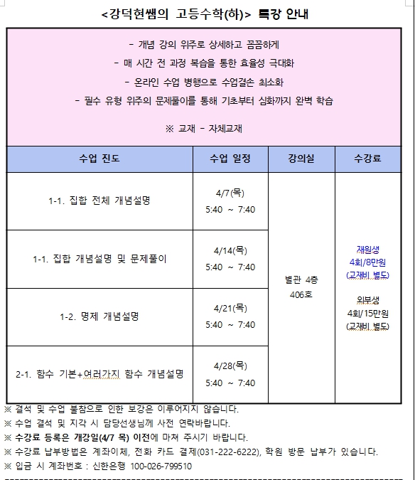 * 4월 7일(목) 고등수학(하) 단과 개강합니다.