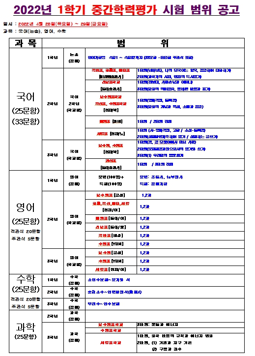2022년 1학기 중간고사 학력평가 시험범위 공고
