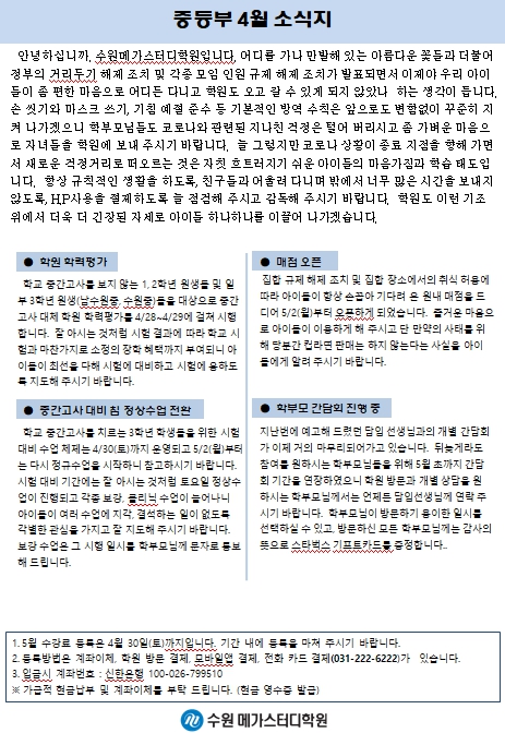 * 5월 등록기간은 4월 30일까지 이며, 4월 28일~29일 1,2학년 전첼와 3학년 일부 학교(남수원, 수원중) 학원 자체 중간고사를 실시합니다.