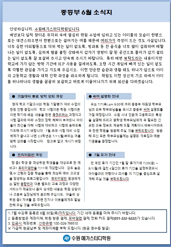 2022년 중등부 6월 소식지(가정통신문) 페이지 정보 작성자 최고관리자 작성일 22-06-21 15:52 조회 4,511회 댓글 0건 본문 * 2학기 기말고사(2,3학년) 및 기말학력평가(1학년) 기간입니다. 최선을 다해 좋은 결과가 있기 바랍니다.
