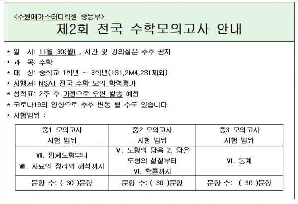 제2회 전국 수학모의고사 안내 페이지 정보 작성자 최고관리자 작성일 20-11-13 17:29 조회 4,629회 댓글 0건 본문 * 수원메가스터디학원 제2회 전국단위 수학모의고사 안내입니다.