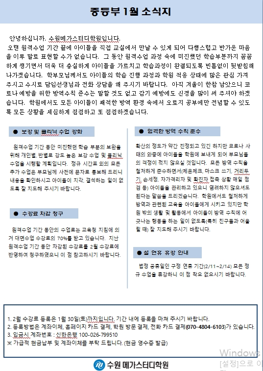 2021년 1월 소식지(가정통신문) 페이지 정보 작성자 최고관리자 작성일 21-01-25 21:04 조회 4,615회 댓글 0건 본문 * 2021년 중등부 1월 소식지(가정통신문)입니다.