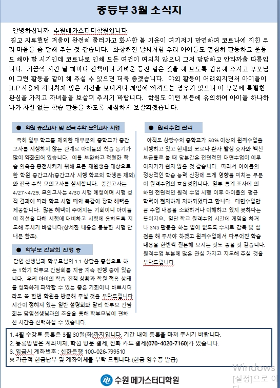 * 수원메가스터디학원 중등부 3월 소식지(가정통신문)입니다.