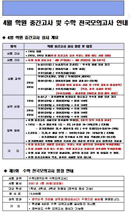 2021년 4월 학원 중간고사 및 수학 전국모의고사 안내