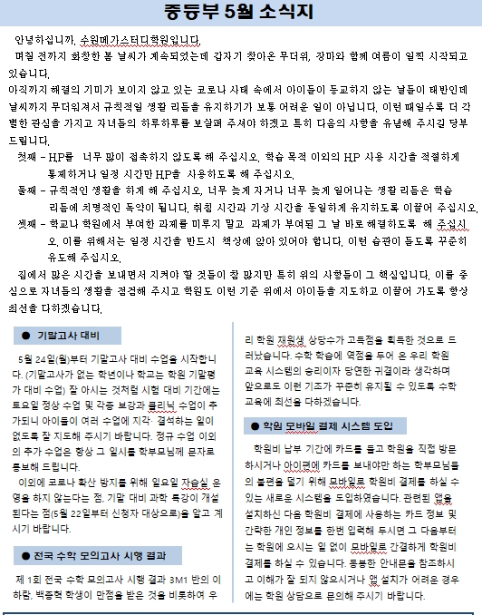 * 이달부터 핸드폰 모바일 결제 시스템을 운영하오니 편리하게 가정에서 휴대폰으로 학원비를 결제하실 수 있습니다.