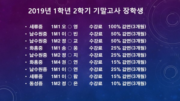 2019년 1학년 2학기 학원 기말고사 장학생 명단(3개월)