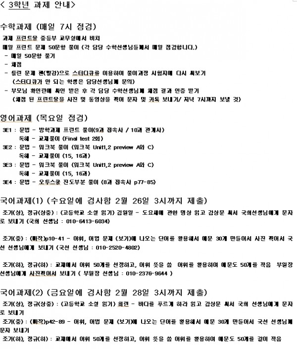 수학 과제의 경우 결석했거나 휴원 요청한 학생은 중등부 교무실(3시~10시 사이)이나 학원 본관 1층 상담실(오전 9시~오후 3시 사이)에서 받아가서 매일 50문항씩 풀고 그 내용을 제출해야 합니다.