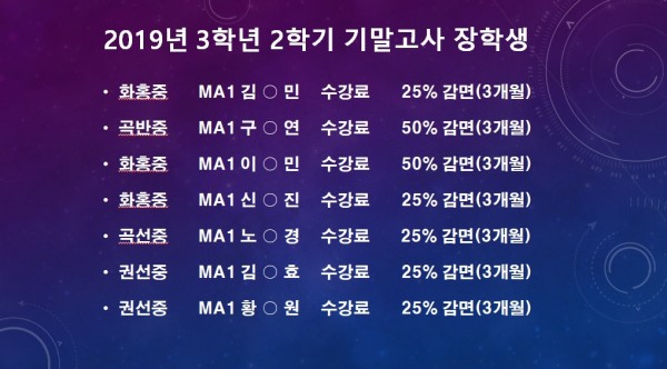 2019년 3학년 2학기 기말고사 장학생 명단(3개월 혜택)