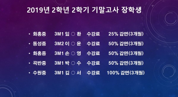 2019년 2학년 2학기 기말고사 장학생 명단(3개월 혜텍)