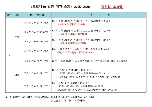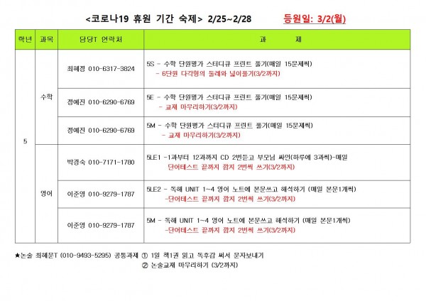 코로나 19 휴원 기간 숙제 2/25~2/28 5,6학년 용 공지 페이지 정보 작성자 최고관리자 작성일 20-02-25 16:46 조회 4,996회 댓글 0건 본문 코로나 19 휴원 기간 숙제 2/25~2/28 5,6학년 용 공지 각별히 건강에 유의하는 한 주 되시길 바랍니다.