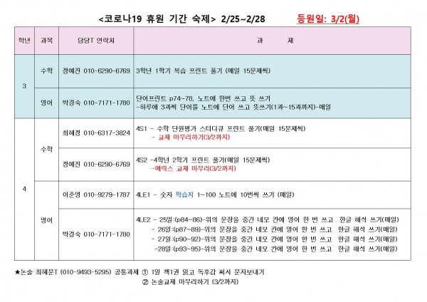 코로나 19 휴원 기간 숙제 2/25~2/28 3,4학년 용 공지 페이지 정보 작성자 최고관리자 작성일 20-02-25 16:45 조회 4,921회 댓글 0건 본문 코로나 19 휴원 기간 숙제 2/25~2/28 3,4학년 용 공지 각별히 건강에 유의하는 한 주 되시길 바랍니다.