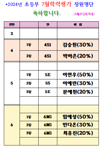 7월 기말학력평가 장원명단 페이지 정보 작성자 최고관리자 작성일 24-07-19 14:16 조회 4,169회 댓글 0건 본문 축하합니다 국어,영어,수학,사회,과학 5과목(1학기과정)을 시험 본 결과 우수한 성적으로 장원을 하였습니다.