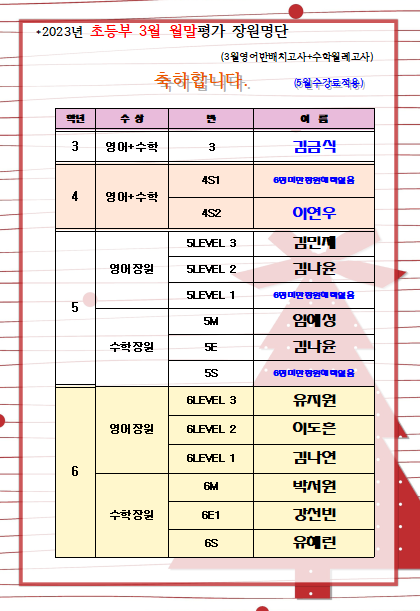 영어반배치고사및 수학 3월 월례고사 장원