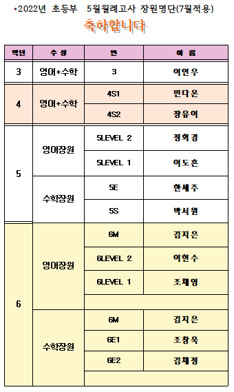 5월 월례고사 장원명단