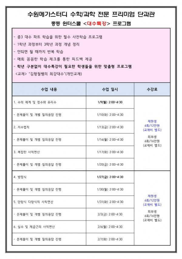 중등 윈터스쿨 <대수특강> 프로그램 안내