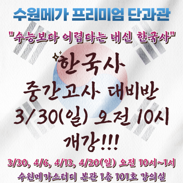 고등 한국사 중간고사 대비 프로그램 개강 페이지 정보 작성자 최고관리자 작성일 25-03-21 11:10 조회 1,384회 댓글 0건 본문 4주 동안 진행되는 단기 한국사 내신대비 단과 프로그램 <메가스터디 본원 강사 직강>