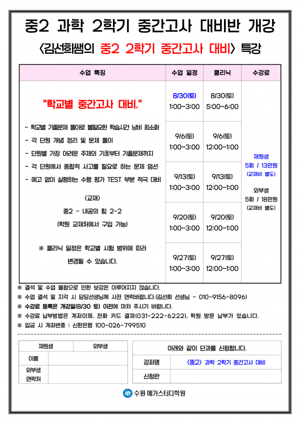 중등 과학 2학기 중간고사 대비 프로그램 개강 페이지 정보 작성자 최고관리자 작성일 25-05-13 15:21 조회 1,277회 댓글 0건 본문 중등 과학 2학기 중간고사 대비 프로그램 개강