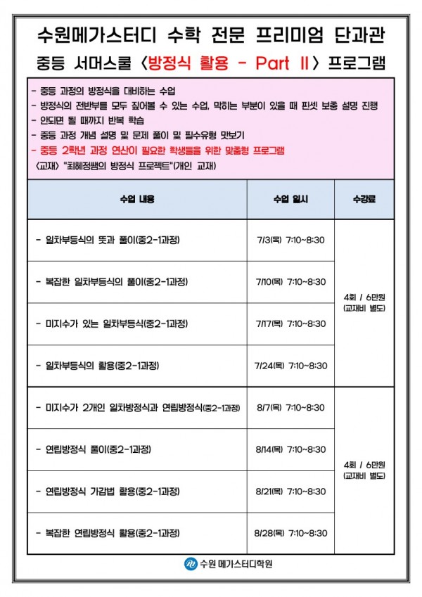 2025 중등부 여름방학 수학 특강(중2-1 방정식 활용 특강) 페이지 정보 작성자 최고관리자 작성일 25-06-19 15:22 조회 1,179회 댓글 0건 본문 여름방학 중2-1 방정식 활용 특강 안내