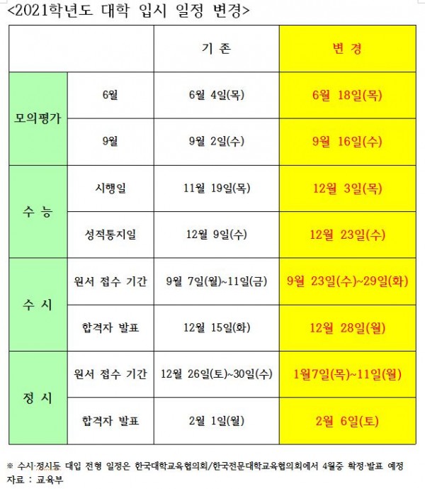 공지 2021학년도 대학 입시 일정 변경 안내