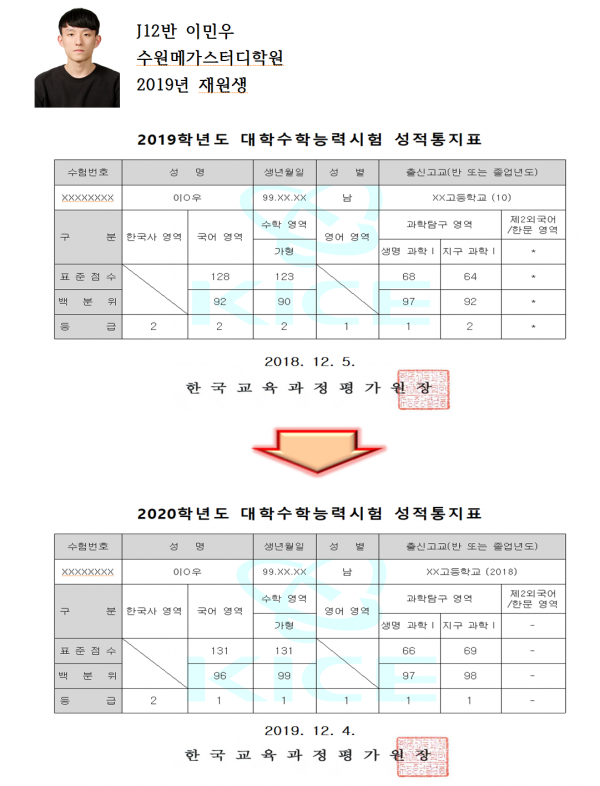 저는 동네 학원부터 오직 최상위권 의대 지망생들만 다니는 학원까지 여러 재수 학원들을 다녀보았습니다. 객관적인 입장에서 가감없이 말씀드리자면 수원 메가스터디는 최고의 자습, 학습 분위기는 물론 선생님들의 수업 수준까지 굉장히 뛰어나시기에 효율적이고 수능에 가장 적합한 수업을 들을 수 있는 학원이라는 것을 말씀드릴 수 있습니다. 그러나 학원이 좋다고한들 선생님께서 말씀하시는 방법이 아닌 자신이 맞다고 생각하는 학습방법을 고집한다면 성적은 그리 쉽게 오르지 않을 것입니다. 항상 선생님들의 말씀을 경청하고 ‘소통’하려는 자세를 지닌다면 이번 수능 성적표는 자신이 만족하고도 남을 결과가 나타날 것이라고 장담할 수 있습니다. 포기하지 마시고 항상 초심을 잃지 않으시길 바랍니다.