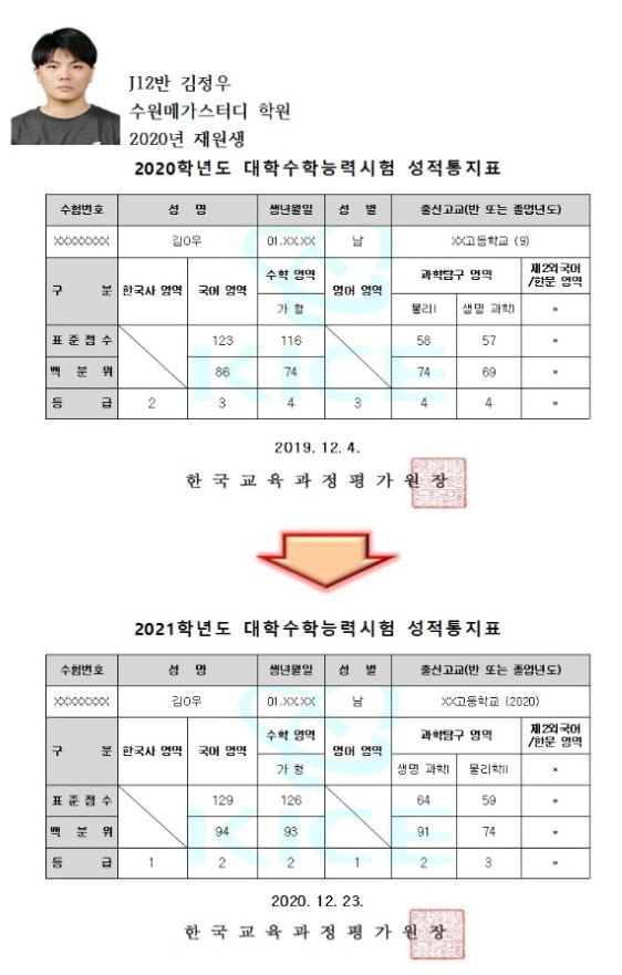 안녕하세요. 전 2020년도 수원메가에서 재수해 21학년도 수능을 본 김정우입니다