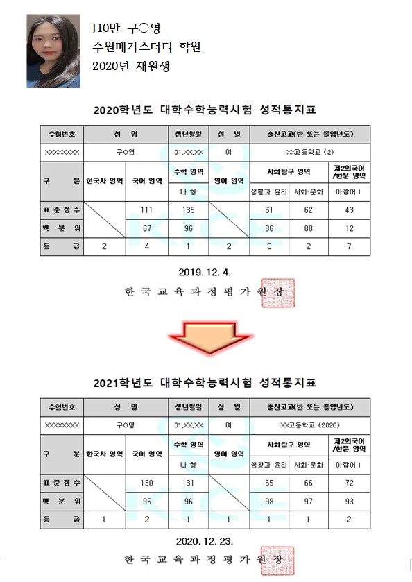 물론 모두가 N수를 하는 것도 아니고 모두가 N수를 성공하는 것도 아니지만 적어도 이 글에 공감하시면서 읽으셨다면, 독해질 용기가 있으시다면 감히 성공하실거란 말을 전해드리고 싶네요. 수원 메가스터디 가셔서 저처럼 기적적인 성공 사례 만들어서 올해 연말은 행복하게 보내시길 기원하겠습니다.