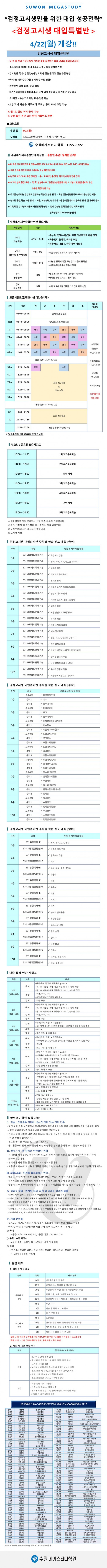 재수 검정고시생 대입특별반 개강 안내 페이지 정보 작성자 최고관리자 작성일 24-04-03 11:47 조회 3,192회 댓글 0건 본문 - 개강 인원에 미달하면 개설이 안 될 수 있습니다. - 7월 2학기에는 기존 종합반으로 편입됩니다.