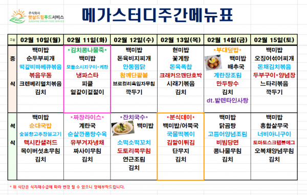 2월 2주차 식단표(2/10~2/15)