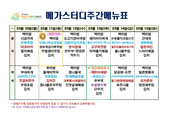3월 2주차 식단표(3/10~3/15)
