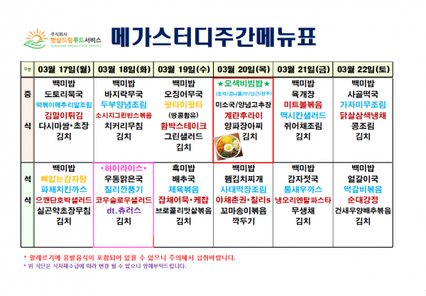 3월 3주차 식단표(3/17~3/22)