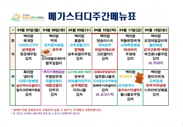 4월 2주차 식단표(4/7~4/12)