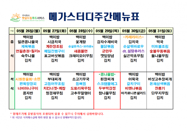 5월 4주차 식단표(5/26~5/31)
