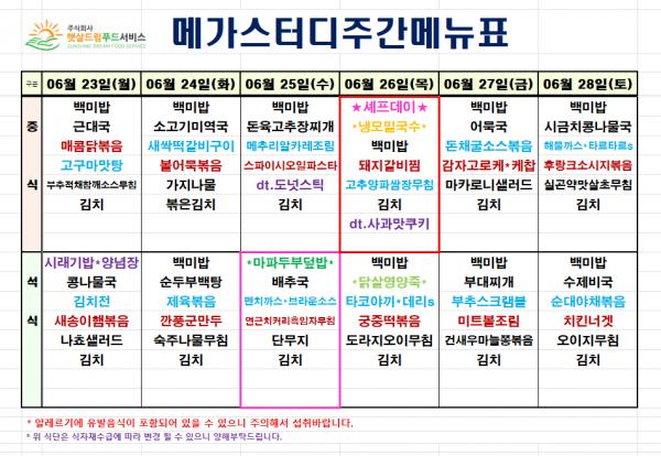 6월 4주차 식단표(6/23~6/28)
