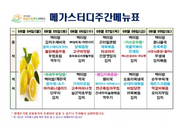 8월 1주차 식단표(8/5~8/9)