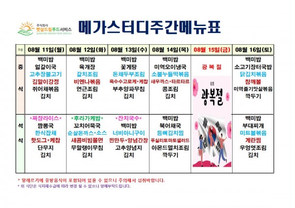 8월 2주차 식단표(8/11~8/16)