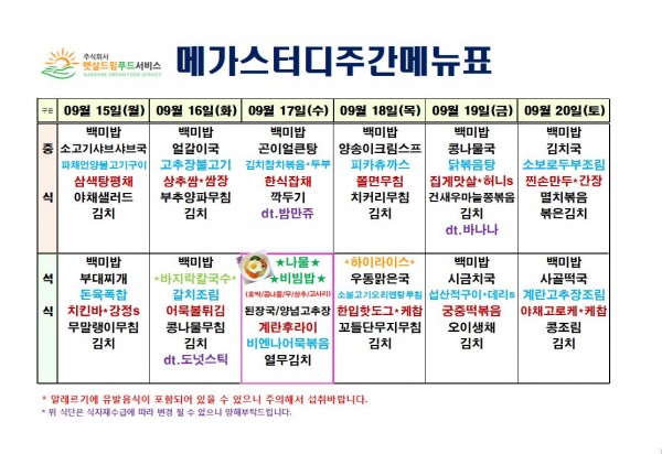 9월 3주차 식단표(9/15~9/20)