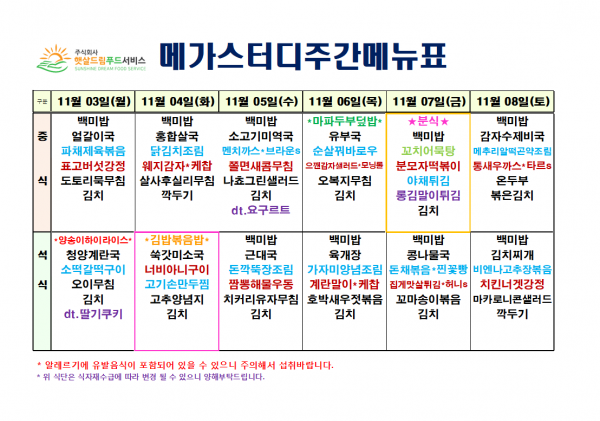11월 1주차 식단표(11/3~11/8)