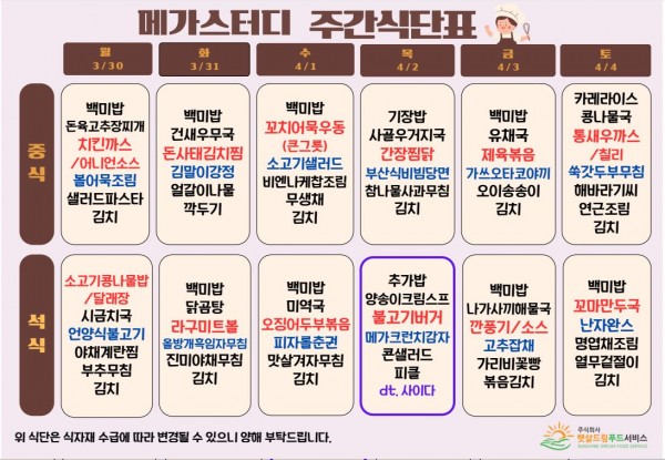 3월 5주차 식단표(3/30~4/4)
